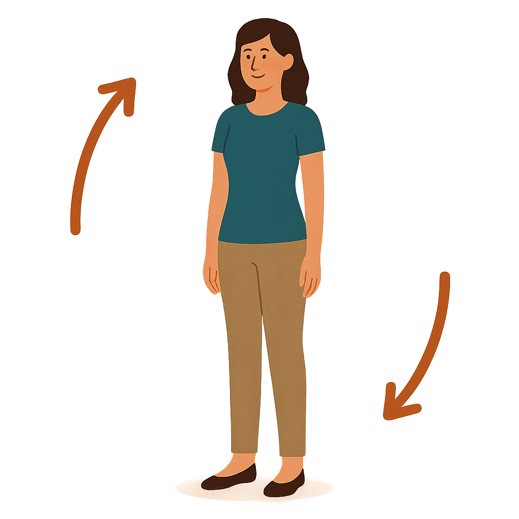 裸足か薄い靴下で立ち、足裏の母趾球・小趾球・かかとに同じくらい体重が乗っているかを感じます。左右どちらかが重いなら、片足荷重ぎみ。